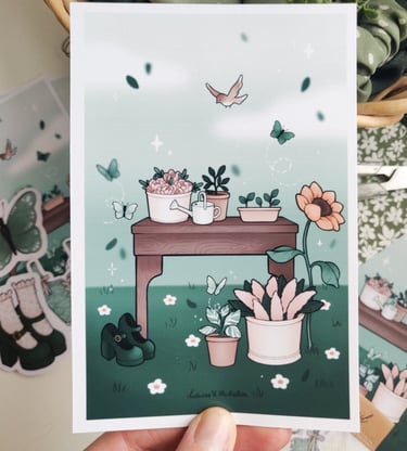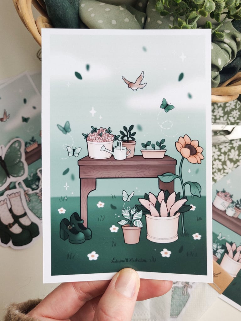 Mes illustrations sont imprimées et découpées par mes soins, dans mon petit atelier d'Auvergne. Elles sont parfaites pour les filles adeptes de slow life, de nature et de décoration. Pour décorer vos murs, votre coin cozy préféré, ou bien à coller dans votre carnet de journaling. Mes illustrations sont à la fois douces et colorées, inspirées de la beauté de la nature, de la vie lente et du charme de la campagne. Plonge dans mon univers cozy en choisissant tes prints préférés à collectionner. ♥